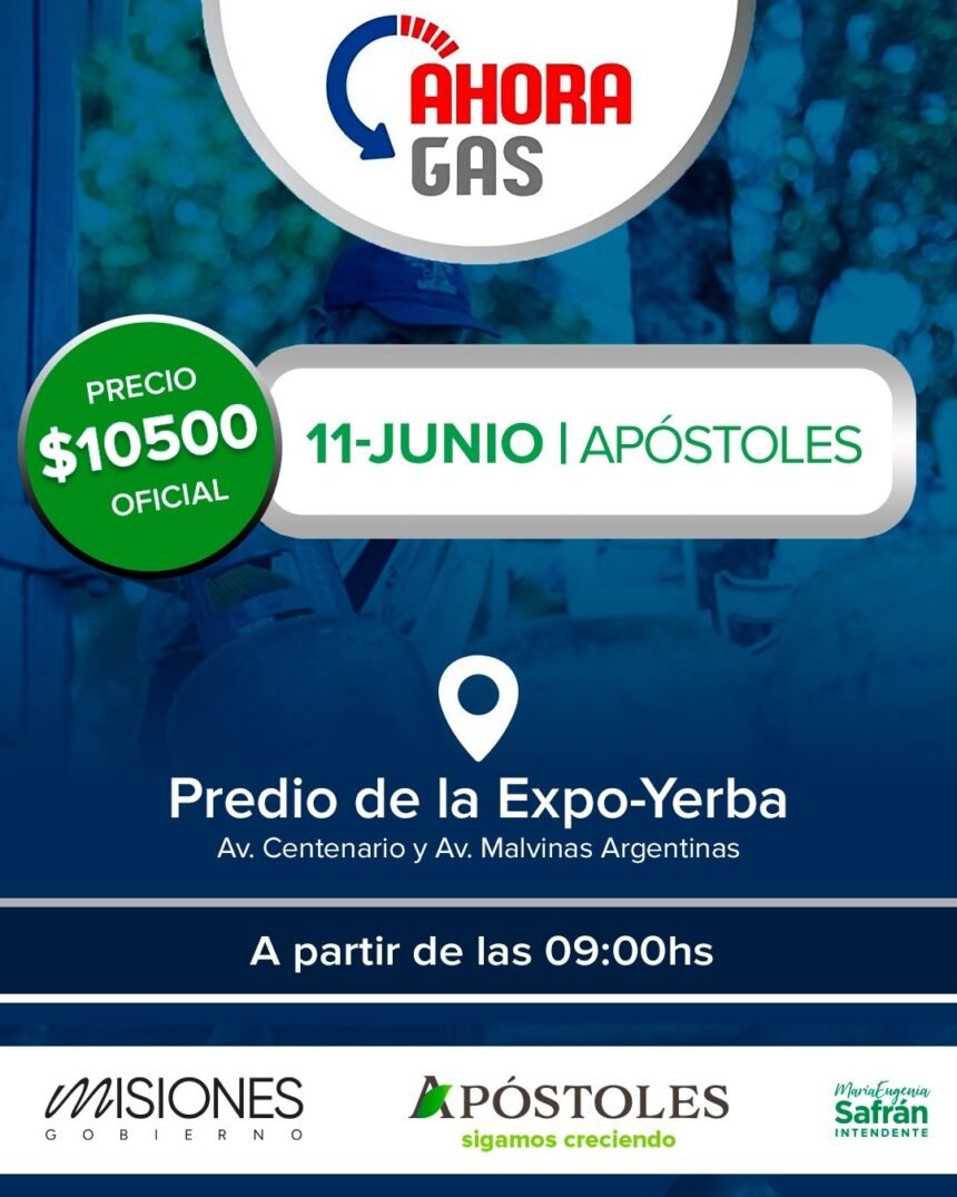 El programa provincial Ahora Gas llega a Apóstoles el miércoles 11 de junio, brindando a los vecinos la oportunidad de recargar sus garrafas de GLP de 10 kg a un precio bonificado de $10.500.