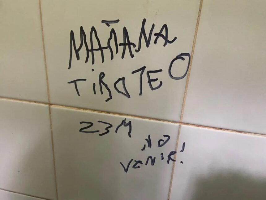 En la mañana de este miércoles, circuló en grupos de padres del turno mañana de un colegio privado de Candelaria una foto tomada en los sanitarios de varones. En la imagen se lee claramente: “Mañana tiroteo, 24M no venir”.