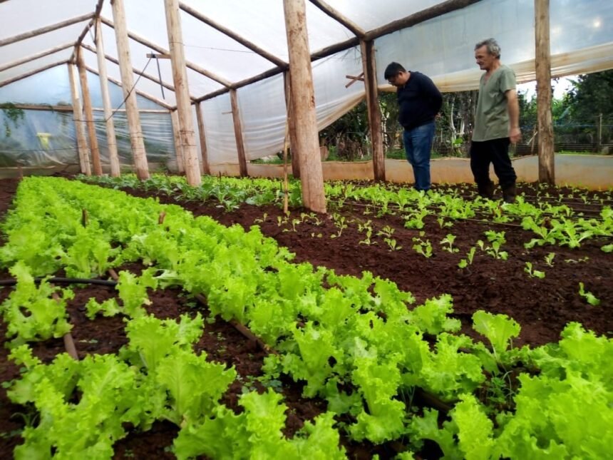El Director del área, Julio Cuenca y el Jefe de Desarrollo Social, Dany Maciel visitaron el predio productivo de Carlitos, al quien hace unas semanas se le asistió con abono para que pueda realizar el trasplante de lechugas, para ver el avance que tuvo en la producción.