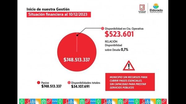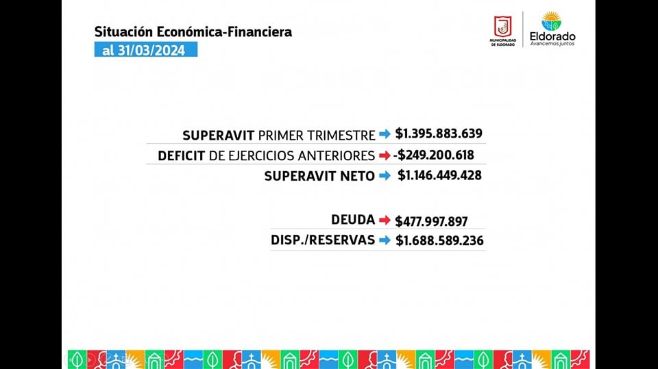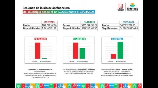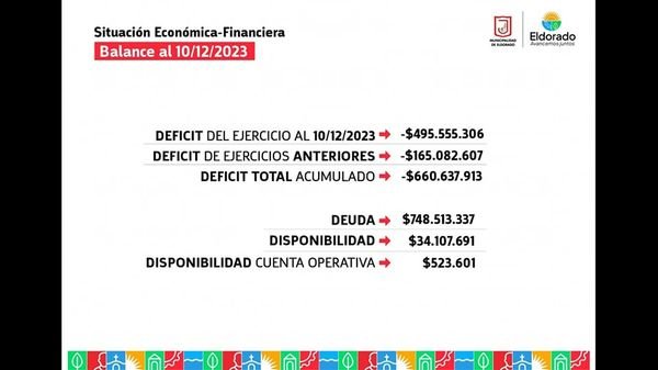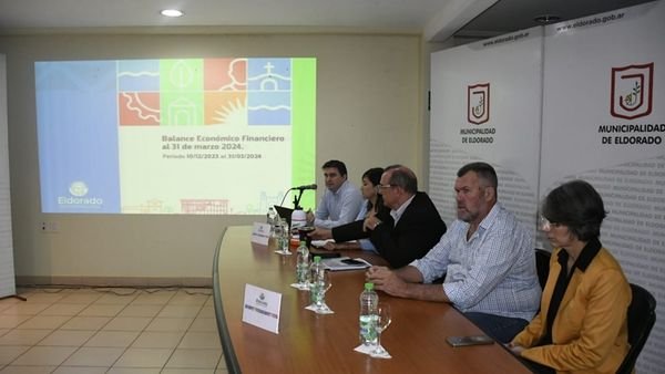 Este lunes, el Intendente de la Ciudad de Eldorado, Dr. Rodrigo Durán, junto a la Viceintendente, Dra. Lorena Cardozo; al Secretario de Hacienda, C.P Marcelo Mikulán; al Secretario de Obras y Servicios Públicos, Agrón. Roberto Haaser y a la Directora de Planeamiento, Arq. Viviana Fonseca; brindaron un balance económico de los primeros cuatro meses de gestión.