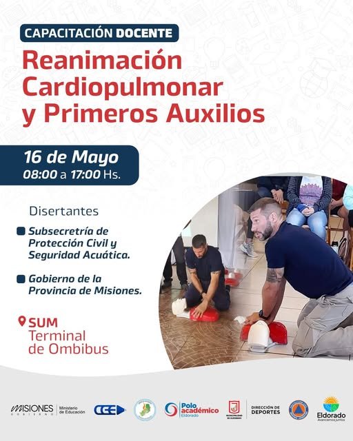 Este viernes 16 de mayo, de 08:00 a 17:00 hs, se llevará a cabo una jornada de Capacitación en Reanimación Cardiopulmonar (RCP) y Primeros Auxilios, destinada a docentes.