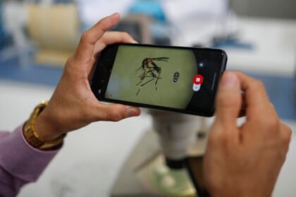Un investigador toma una fotografía de un zancudo visto en un microscopio…