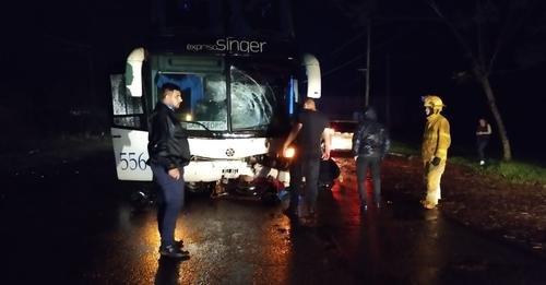 Un siniestro vial estremeció a la tranquila localidad de Dos de Mayo en la noche de hoy, cuando un colectivo operado por la empresa Singer, chocó con una motocicleta en la avenida del Colono, a la altura del cementerio. La víctima debió ser trasladada al hospital.