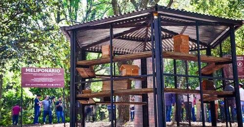 Un meliponario es un lugar que alberga abejas de la tribu meliponini, que no tienen aguijón y no pican. Consta de una estructura tipo jaula que ayuda a proteger a las colmenas o simplemente distribuirlas en el parque. “La importancia es la polinización de la flora nativa y también exótica, que a la vez es alimento de pájaros y producción de cultivos del bosque”, señaló Aquino.