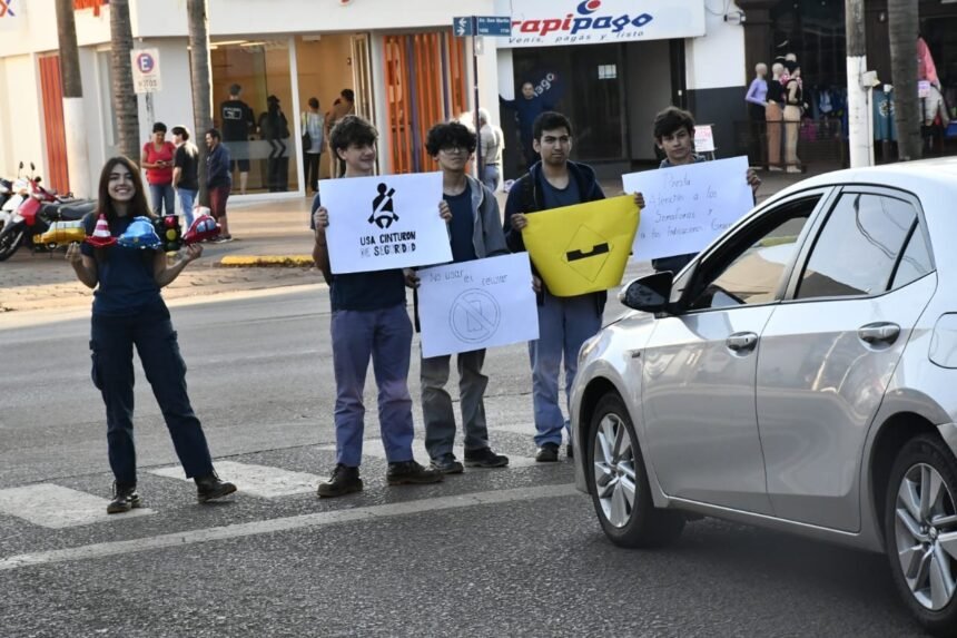 Mostrando carteles y compartiendo información con peatones y conductores, los estudiantes llevaron adelante la difusión de las normas de seguridad vial.