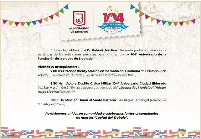 El Intendente Municipal, Dr. Fabio R. Martínez, invitó a la comunidad a participar de las actividades previstas para conmemorar el 104º Aniversario de la Fundación de la ciudad de Eldorado.