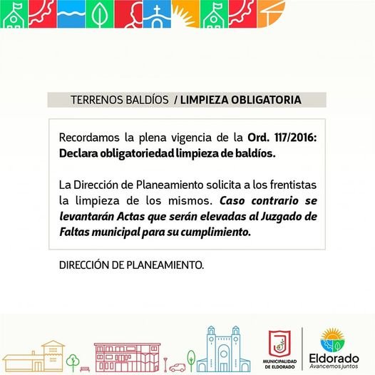La Municipalidad de Eldorado, a través de la Dirección de Planeamiento, recuerda que se encuentra en plena vigencia la Ordenanza 117/2016, que declara obligatoriedad de la limpieza de baldíos.