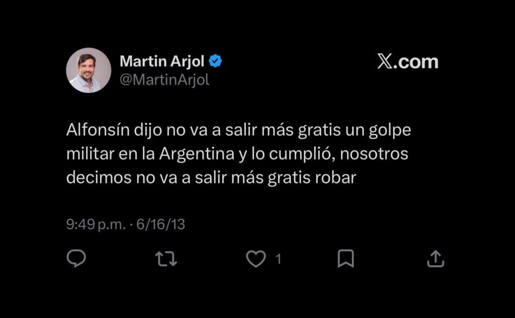 El diputado provincial Martín Arjol, identificado actualmente con el espacio libertario, volvió a quedar en el centro de la polémica tras compartir un video de Casa Rosada del 24 de marzo en sus redes sociales que contiene críticas hacia la figura de Raúl Alfonsín. El gesto generó fuertes cuestionamientos debido a su pasado reciente dentro de la Unión Cívica Radical (UCR), partido con el que construyó gran parte de su carrera política y ocupó diversos cargos electivos.