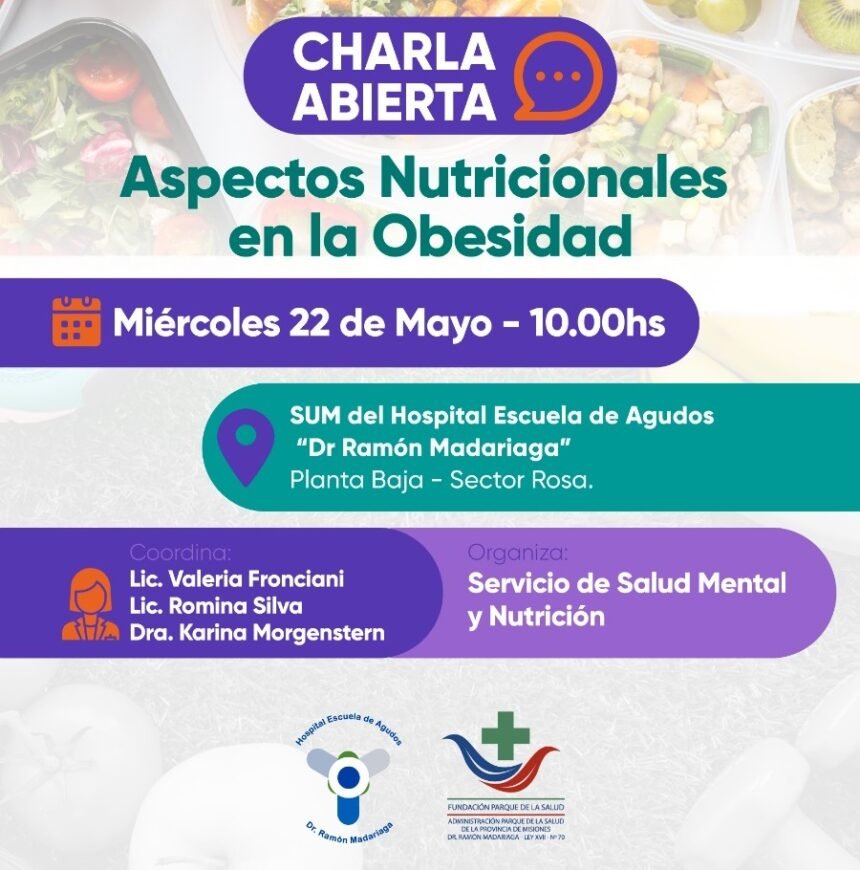 Los equipos de los servicios de Salud Mental y Nutrición del Hospital Escuela de Agudos dr. Ramón Madariaga llevan adelante una serie de encuentros abiertos al público que apuntan a reflexionar sobre los efectos de la obesidad. En esa ocasión, invitan a una charla sobre aspectos nutricionales de esta enfermedad.