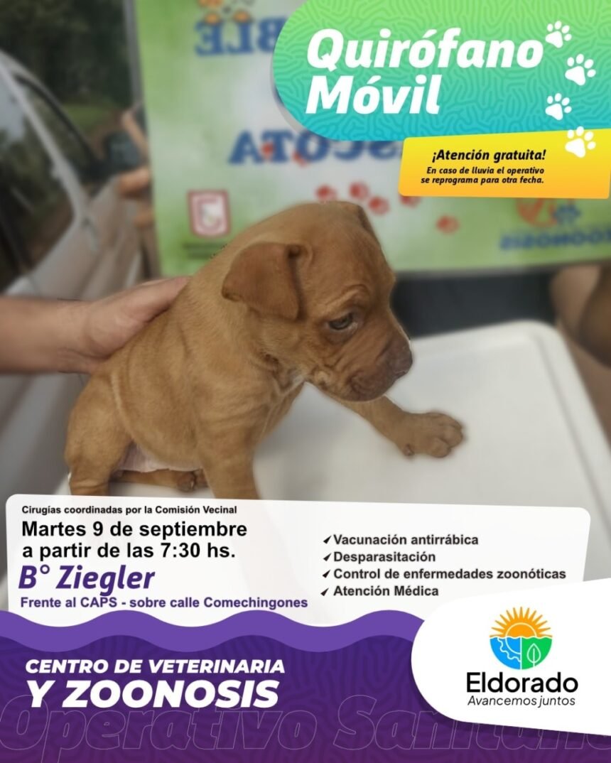 El martes 9 de septiembre a partir de las 7:30 hs llega el Quirófano Móvil al barrio Ziegler (frente al CAPS sobre calle Comechingones). Durante la jornada se realizará castraciones, vacunación antirrábica, desparasitación y control de enfermedades zoonóticas.