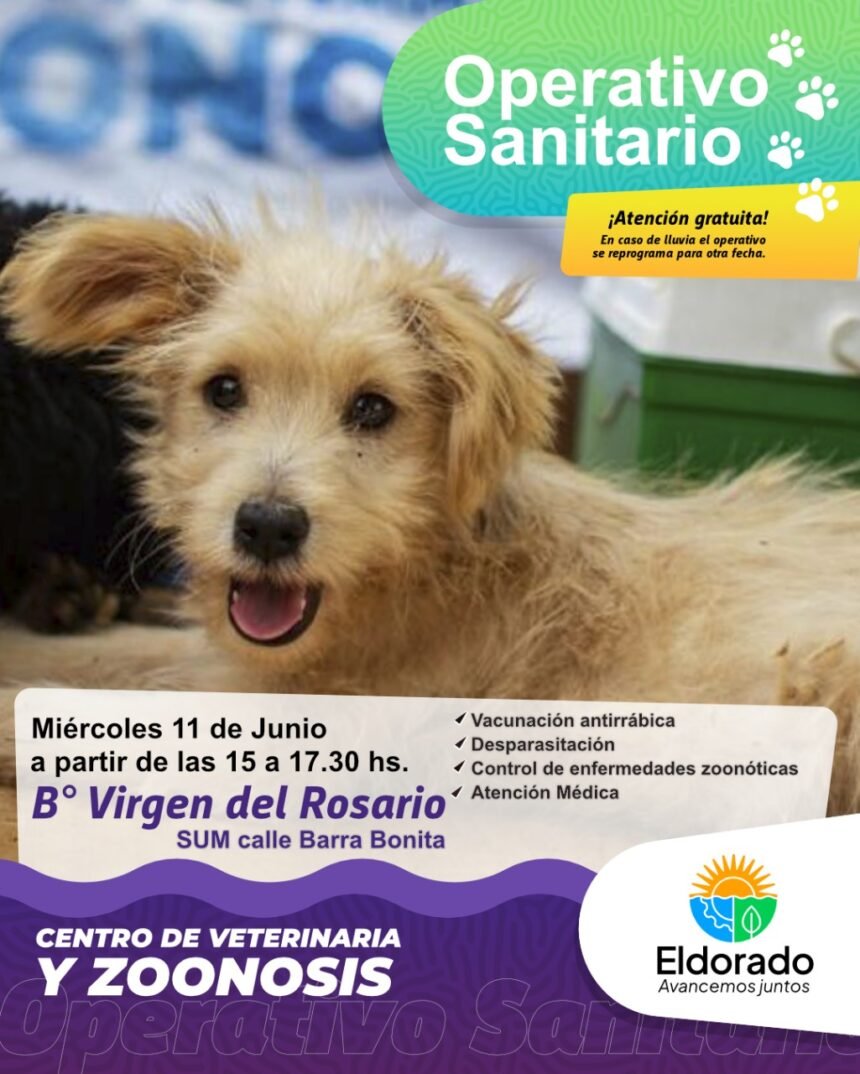 Este miércoles 11 de junio el Centro de Veterinaria y Zoonosis de la Municipalidad de Eldorado realizará un nuevo operativo de atención gratuita. Esta vez la actividad se desarrollará en el barrio Virgen del Rosario a las 15hs.