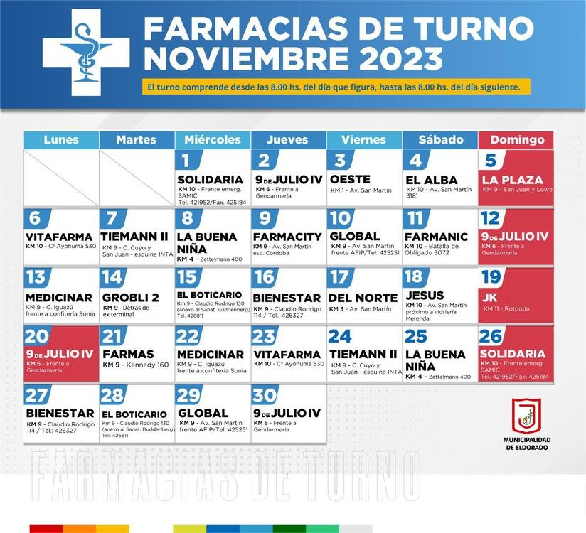 Desde el Colegio de Farmacéuticos se informa el nuevo calendario de guardia correspondiente al mes de noviembre.