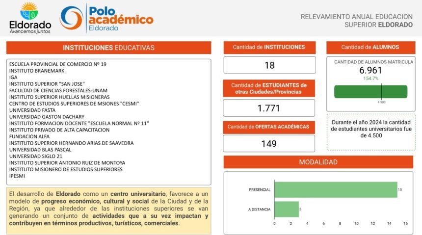 El relevamiento anual de Educación Superior realizado por el equipo del Polo Académico Eldorado, muestra un importante crecimiento en el sector educativo en la ciudad. Actualmente, existen 18 instituciones de nivel superior que ofrecen un total de 149 propuestas académicas en diversas áreas, tanto en modalidad presencial como a distancia.