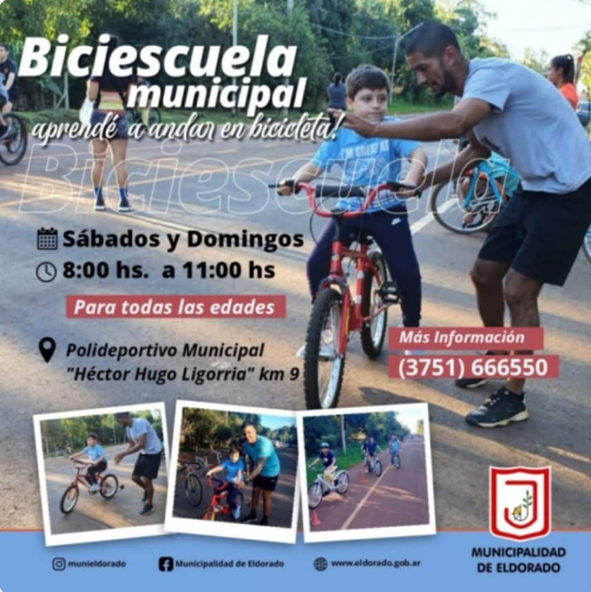 La comunidad de Eldorado impulsa la actividad física y el aprendizaje. Desde hace tres semana, funciona una biciescuela para niños, jóvenes y adultos que tengan la intención de incursionar en la práctica. La actividad se lleva a cabo los días sábado y domingo en el Polideportivo Km 9. El objetivo es enfatizar en la educación vial sana, responsable y segura.