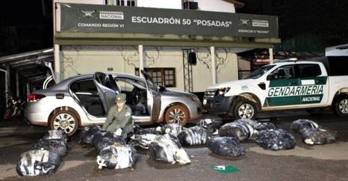 La posterior requisa del rodado resultó en el hallazgo de las bolsas de arpillera envueltas en nylon negro con alrededor de 205 kilos de marihuana, en asientos traseros y el baúl. También detectaron una bolsita con 3 gramos de clorhidrato de cocaína, en la guantera.