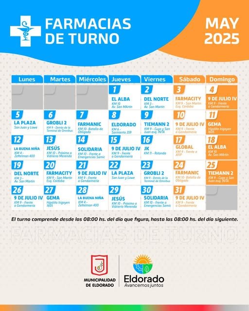 LocalesSalud Farmacia de turno mes de mayo! Last updated: 2025/05/09 at 8:43 PM Somos Vos Share SHARE You Might Also Like Ola de calor: recomendaciones y cuidados para prevenir complicaciones en la salud Eldorado fortalece la prevención y salud bucal en las escuelas Eldorado | Realizan charlas sobre prevención de adicciones y salud mental en la Unidad Penal III Ganadores del concurso “Sembrando Agua” – Eldorado Inseguridad en Eldorado: El periodista Pedro Krulewesky fue asaltado a punta de faca y le robaron su bicicleta TAGGED: Destacada Somos Vos 9 mayo, 2025 Share this Article Facebook Twitter Whatsapp Whatsapp Telegram Copy Link Print