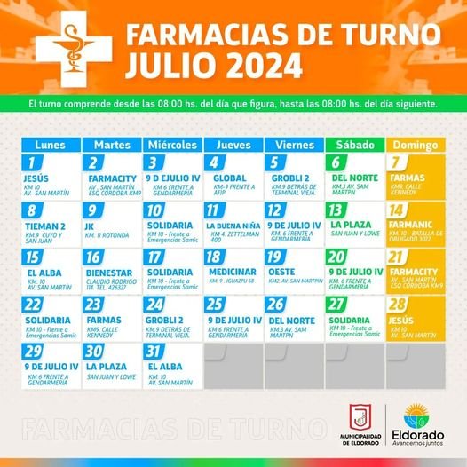 LocalesSalud FARMACIAS DE TURNO JULIO 2024 Last updated: 2024/07/01 at 8:07 PM Somos Vos Share SHARE You Might Also Like Ola de calor: recomendaciones y cuidados para prevenir complicaciones en la salud Eldorado fortalece la prevención y salud bucal en las escuelas Eldorado | Realizan charlas sobre prevención de adicciones y salud mental en la Unidad Penal III Ganadores del concurso “Sembrando Agua” – Eldorado Inseguridad en Eldorado: El periodista Pedro Krulewesky fue asaltado a punta de faca y le robaron su bicicleta TAGGED: Destacada Somos Vos 1 julio, 2024 Share this Article Facebook Twitter Whatsapp Whatsapp Telegram Copy Link Print