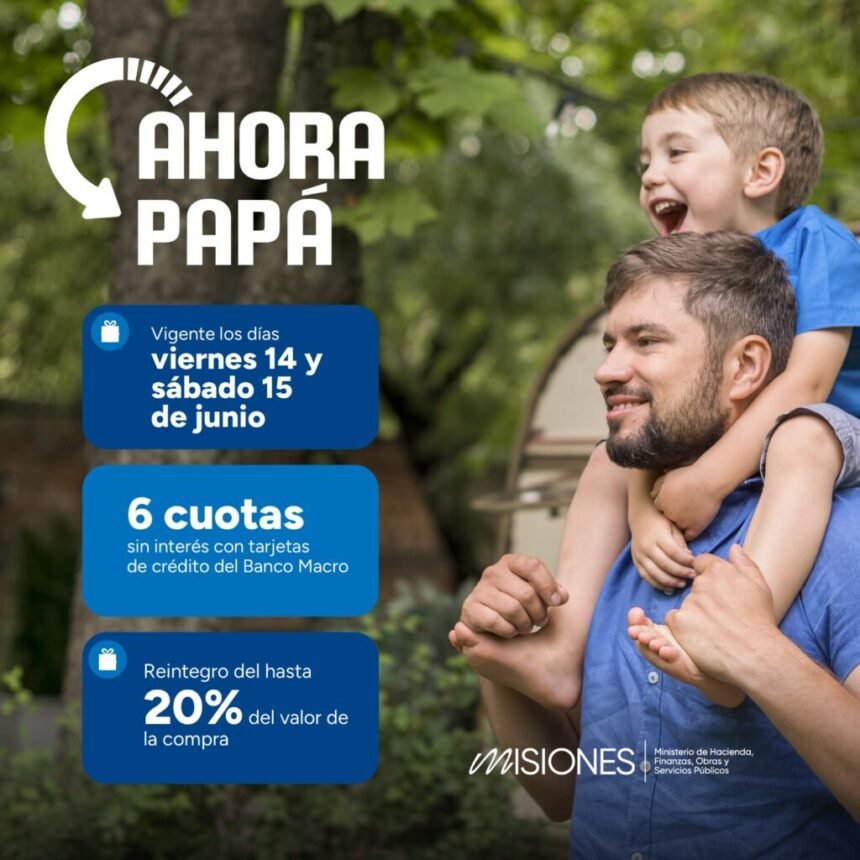 Con motivo del Día del Padre, el gobernador Hugo Passalacqua anunció el lanzamiento del programa “Ahora Papá”, que estará vigente los días viernes 14 y sábado 15 de junio. Esta iniciativa permitirá a los consumidores realizar compras con hasta 6 cuotas sin interés utilizando tarjetas de crédito del Banco Macro y obtener un reintegro de hasta el 20% del valor de la compra.