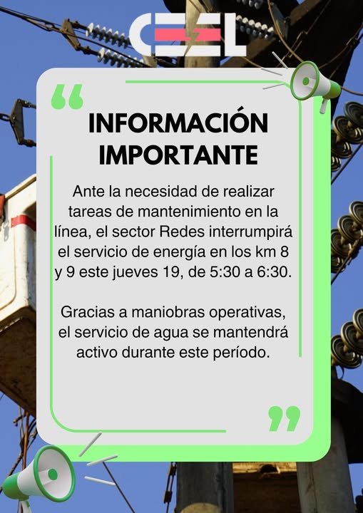 Información GeneralLocales La Cooperativa de Electricidad Eldorado informa que realizarán tareas de mantenimiento de energía, por este motivo, el servicio se verá afectado en los km 8 y 9 mañana, jueves 19 de diciembre, de 5:30h a 6:30h. Last updated: 2024/12/18 at 6:33 PM Somos Vos Share SHARE You Might Also Like Ola de calor: Misiones bajo alerta amarilla por temperaturas extremas Ola de calor: recomendaciones y cuidados para prevenir complicaciones en la salud El Pira Pytá celebró su 89° aniversario con una multitudinaria cena show Oscar Herrera Ahuad, sobre las elecciones legislativas nacionales: “Soy el único responsable de que no hayamos ganado” El gobernador Hugo Passalacqua inauguró la 40° Fiesta Nacional de la Madera en San Vicente: “Es una fiesta que dignifica a todo un sector productivo de la provincia”, sostuvo TAGGED: Destacada Somos Vos 18 diciembre, 2024 Share this Article Facebook Twitter Whatsapp Whatsapp Telegram Copy Link Print