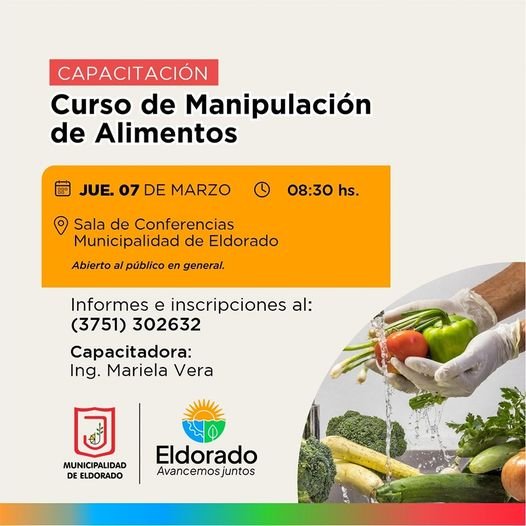 La Dirección de Recursos Humanos con el acompañamiento de la Dirección de Bromatología Veterinaria y Zoonosis de la Municipalidad de Eldorado, brindarán un nuevo Curso de Manipulación de Alimentos.