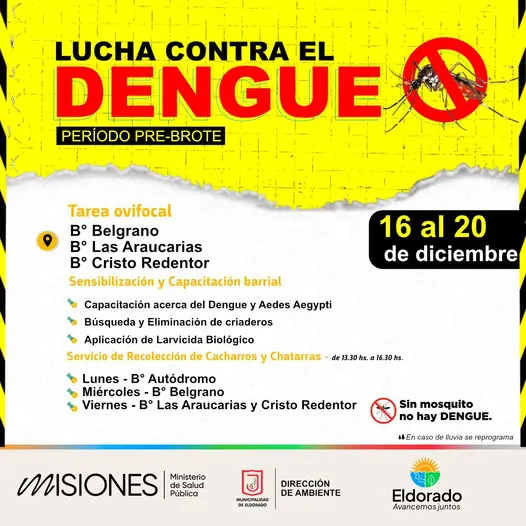 En el marco de lucha contra el dengue, la Municipalidad de Eldorado trabaja en la prevención con tareas ovifocales de pre brote en los barrios. Esta semana, del 16 al 20 de diciembre, las actividades se realizarán en el barrio Belgrano, Las Araucarias y Cristo Redentor.