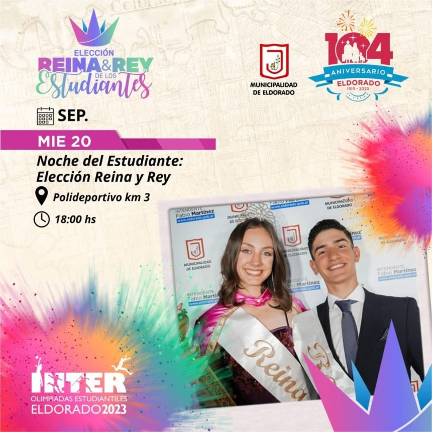 Dentro del marco de las tradicionales Olimpiadas Estudiantiles 2023 el día miércoles 20 de septiembre se llevará a cabo la tradicional elección de Rey y Reina de los Estudiantes en el Polideportivo Municipal y Universitario del km 3, a partir de las 18 hs.