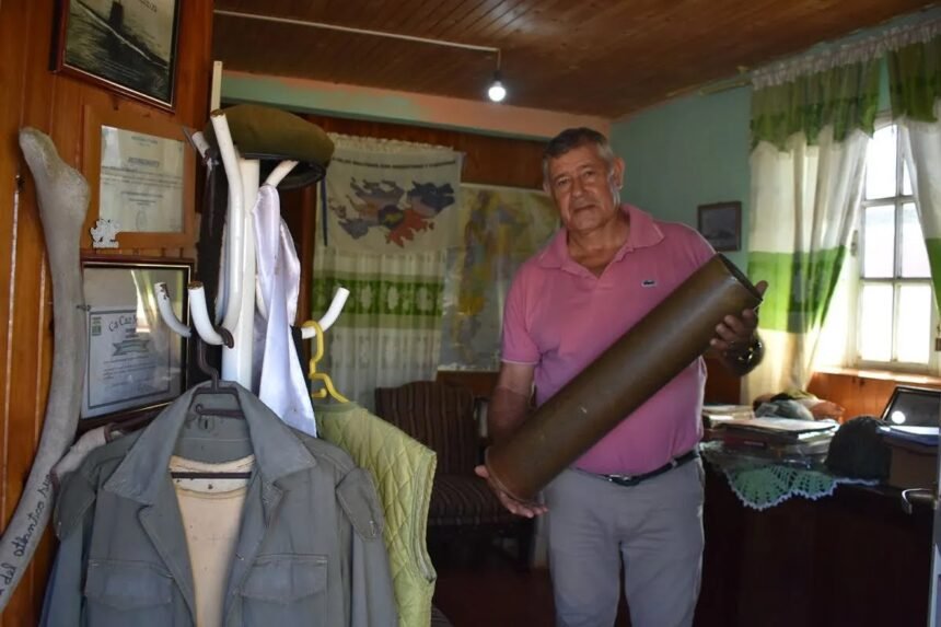 Entre una mirada nostálgica, la voz entrecortada, detalló los objetos que marcaron su vida en combate y pese al paso del tiempo se mantienen, así como fueron traídos de la guerra. “Tenemos vaina de cañón, ropa que se usó en el 82, ropa de infantería de marina que cayó en combate y yo use su remera, el corderito, el colchón de Malvinas y la casa del veterano que era una capa poncho porque el viento constante era de 120 kilómetros por hora, solo con eso soportábamos, hay cascos”, enumeró.
