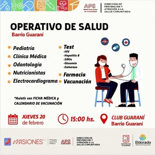 🚑El jueves 20 de febrero se realizará un operativo de salud en el barrio Guaraní (Club Guaraní)