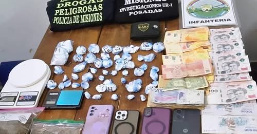 En el lugar, los efectivos hallaron 62 envoltorios de cocaína, 2 de marihuana y 1 con base de cocaína. También se secuestraron cuadernos con anotaciones, balanzas digitales, bolsas de polietileno, tres teléfonos celulares, más de $100.000 en efectivo, además de reales, guaraníes y una motocicleta Corven Energy 110 cc, que sería producto de un ilícito.