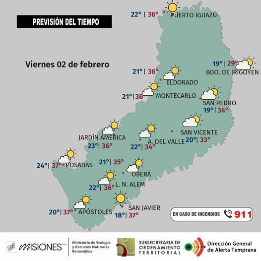 Tiempo seco y caluroso. Se espera un cielo despejado en toda la provincia durante la mañana; pasando el mediodía, se desarrollaría algo de nubosidad y no se descarta alguna precipitación pasajera en Bdo de Irigoyen y zona de influencia debido al calentamiento del aire y la convección. Vientos del noreste colaborarían al aumento de temperaturas en el período de la tarde, con máximas de hasta 37°C.