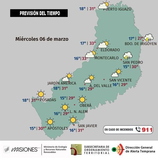 Temperaturas: máxima en la provincia estimada en 33 °C para Montecarlo con 39 °C de sensación térmica; la mínima sería de 15 °C en Apóstoles.