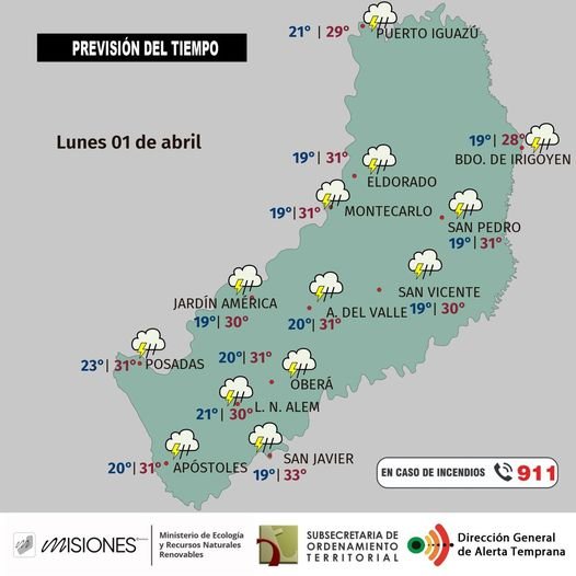 Temperaturas: máxima en la provincia estimada en 32 °C para Posadas con 37°C de sensación térmica; la mínima sería de 19 °C en San Vicente.