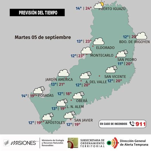 Temperaturas: máxima en la provincia estimada en 24 °C para Puerto Iguazú; la mínima sería de 11 °C en San Pedro.