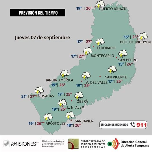 Temperaturas: máxima en la provincia estimada en 27 °C para Posadas con 28 °C de sensación térmica; la mínima sería de 15 °C en Bernardo de Irigoyen.