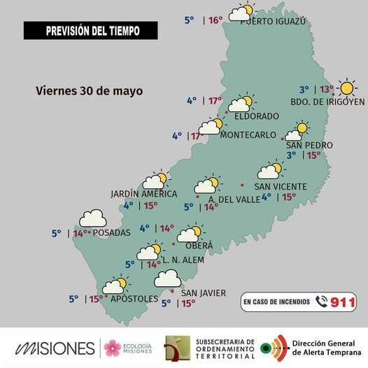 Temperaturas: máxima en la provincia estimada en 17 °C para Eldorado; la mínima sería de 3 °C en San Pedro con sensación térmica de 1 °C.