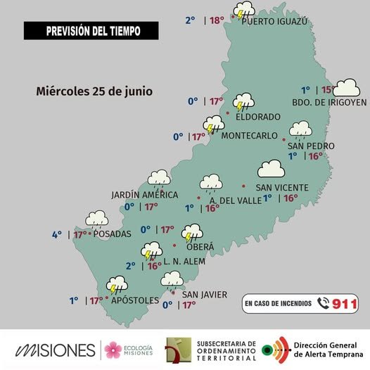 Tiempo bueno, pero desmejorando al final de la tarde. Sigue el frío intenso con probabilidad de heladas durante la madrugada y primeras horas de la mañana en gran parte de Misiones. Estará soleado, con aumento de la nubosidad luego del mediodía y lluvias y tormentas al final de la tarde debido a un área de baja presión en distintos niveles de la atmósfera. Temperaturas mínimas estimadas entre 0 °C y 4 °C. Máximas entre 15 °C y 18 °C.