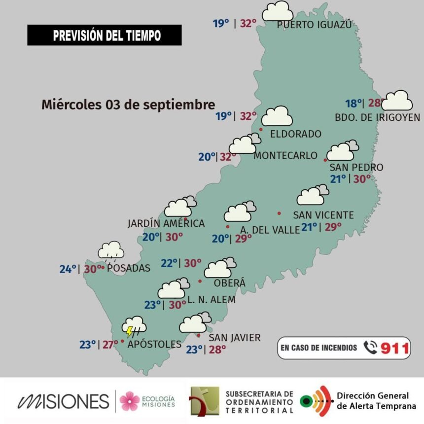 Temperaturas: máxima en la provincia estimada en 32 °C para Montecarlo con una sensación térmica de 34°C, la mínima sería de 18 °C en Bernardo de Irigoyen.