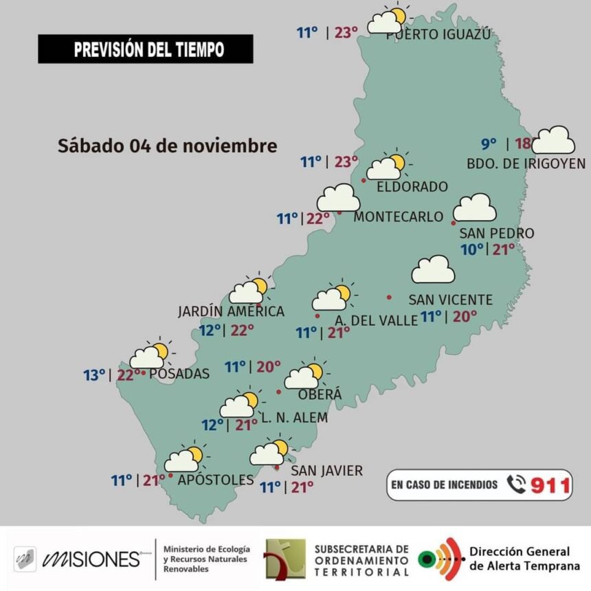 Temperaturas: máxima en la provincia estimada en 23 °C para Eldorado; la mínima sería de 9 °C en Bernardo de Irigoyen con 7 °C de sensación térmica.