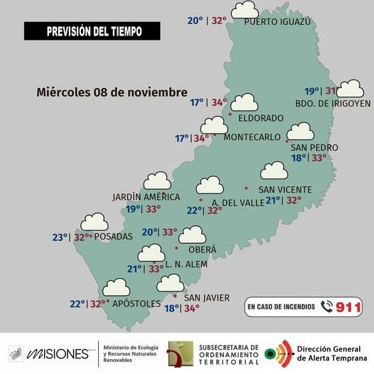 Temperaturas: máxima en la provincia estimada en 34 °C para San Javier con 37 °C de sensación térmica; la mínima sería de 17 °C en Eldorado.