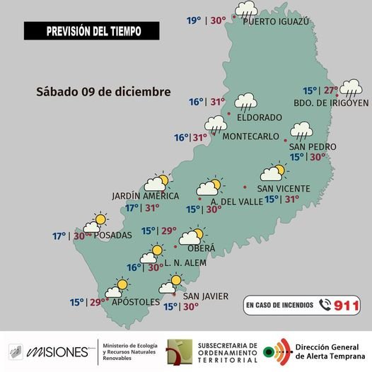 Temperaturas: máxima en la provincia estimada en 31 °C para Eldorado con 35 °C de sensación térmica; la mínima sería de 15 °C en Apóstoles.