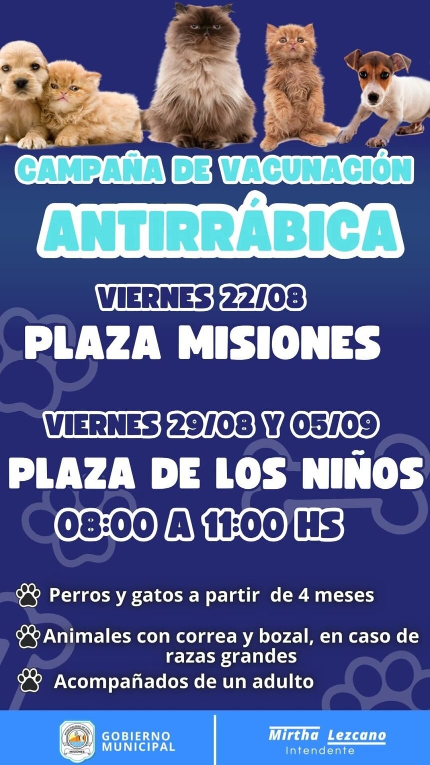 La Municipalidad de Puerto Piray informa a la comunidad que se sigue llevando adelante la campaña gratuita de vacunación antirrábica para perros y gatos.
