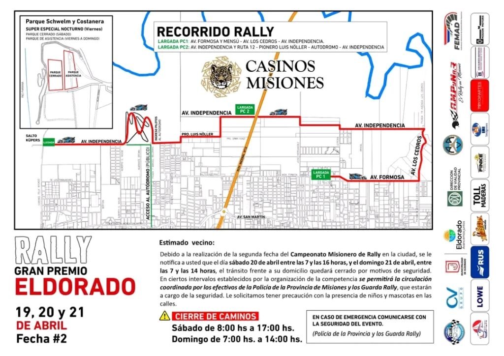 ℹ️En ciertos intervalos establecidos por la organización de la competencia se permitirá la circulación coordinada por los efectivos de la Policía de la Provincia de Misiones y los Guarda Rally, que estarán a cargo de la seguridad.