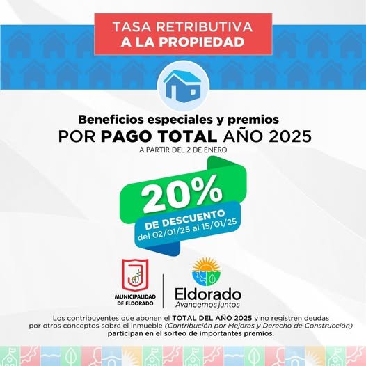 Al abonar la totalidad de la tasa correspondiente al periodo 2025 y no registrar deudas por otros conceptos (Contribución por Mejoras y Derecho de Construcción), los contribuyentes participarán en el sorteo de importantes premios.