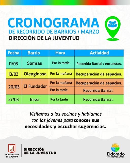 Durante el mes de marzo estaremos recorriendo los barrios Somrau, Oleaginosa, El Fundador y Jossi, para conocer las necesidades de la comunidad y escuchar sus sugerencias.