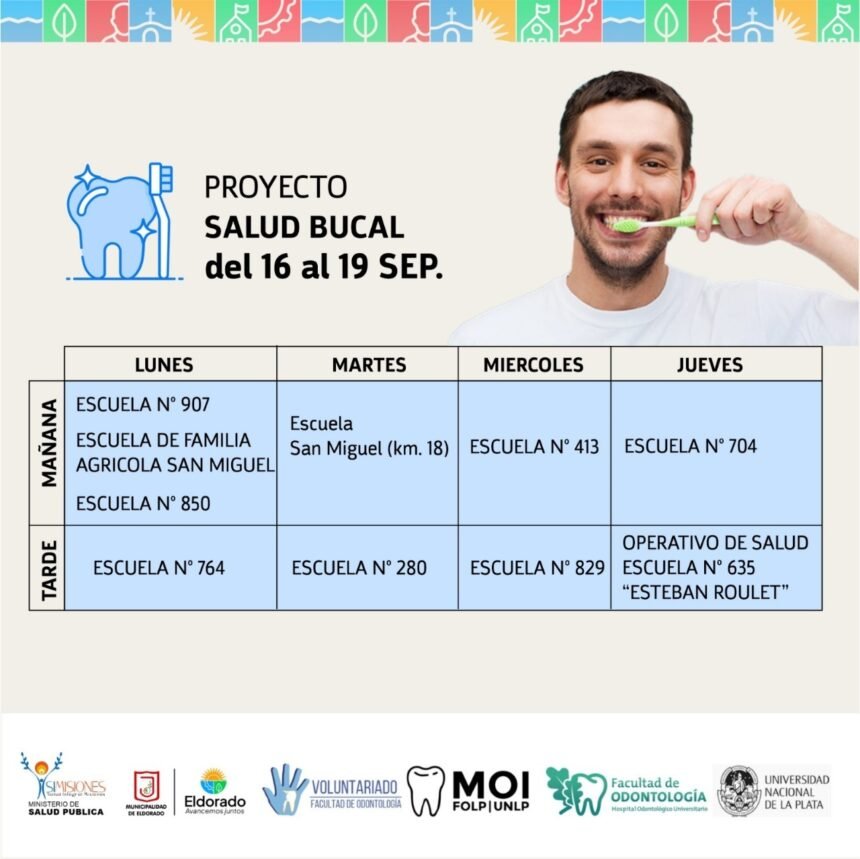 El proyecto denominado “Salud Bucal”, se encuentra a cargo de la Facultad de Odontología de la Universidad Nacional de la Plata; tiene como objetivo principal fortalecer el sistema público de salud de Eldorado a través de acciones preventivas y rehabilitadoras para mejorar la salud bucal.