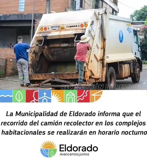 ℹ️La Municipalidad de Eldorado informa que el recorrido del camión recolector en los complejos habitacionales se realizarán en horario nocturno.